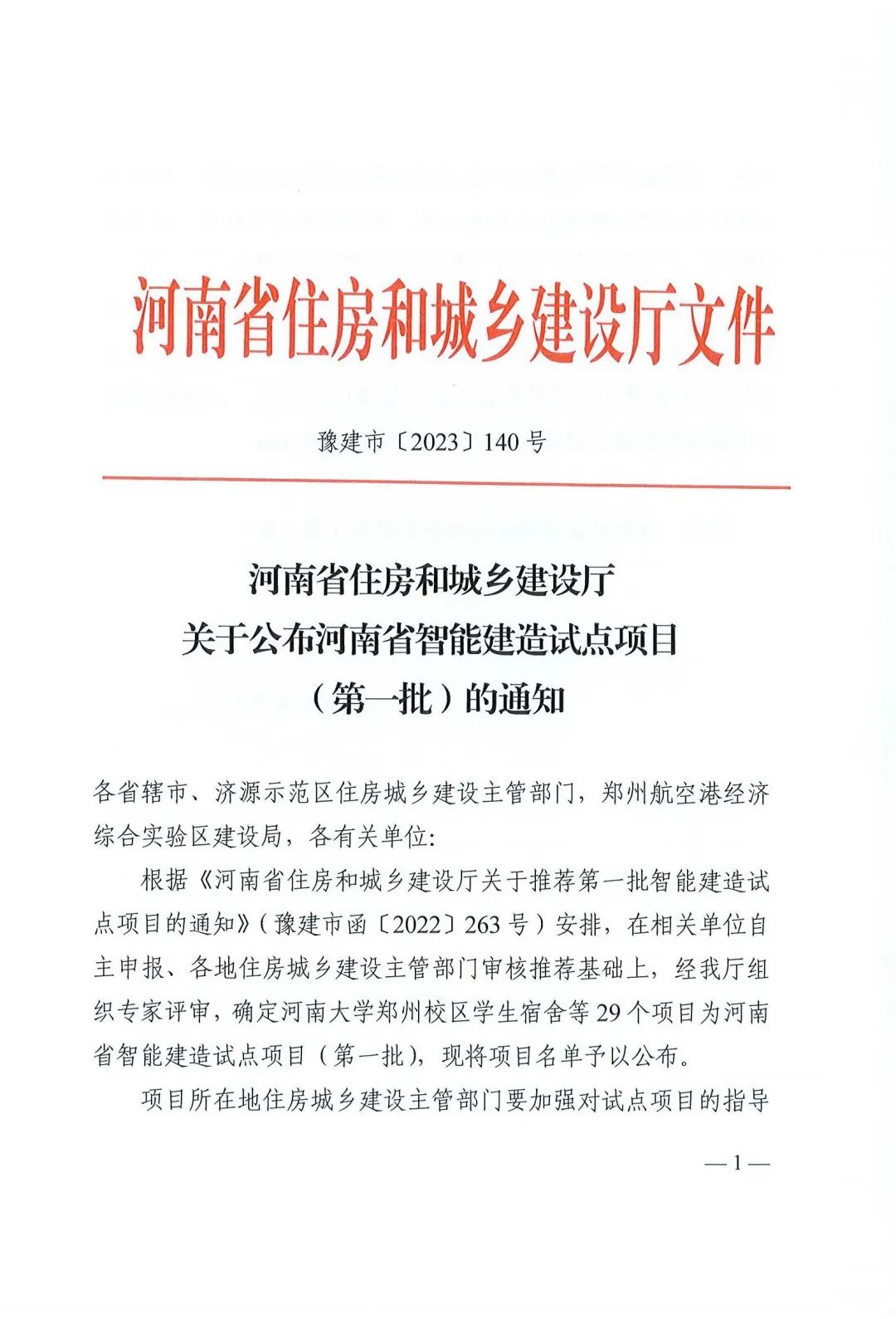 2023年6月7日,河南省住房和城鄉(xiāng)建設(shè)廳公布的河南省智能建造試點(diǎn)項(xiàng)目名單(第一批)中,我公司“省直青年人才公寓博學(xué)苑項(xiàng)目”榮登榜單。