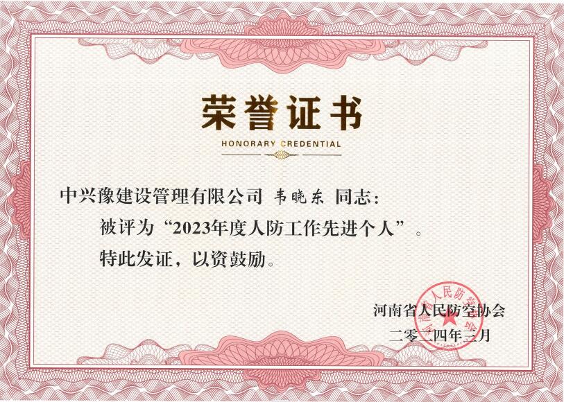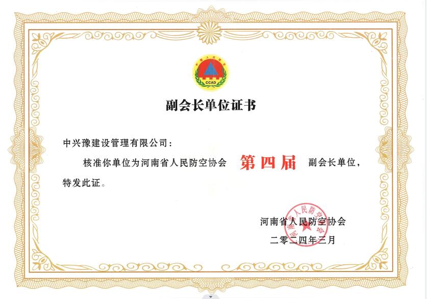 近日,河南省人民防空協(xié)會頒發(fā)了關(guān)于優(yōu)秀會員單位及先進(jìn)工作者的榮譽(yù)證書,我公司核準(zhǔn)為河南省人民防空協(xié)會第四屆副會長單位、2023年度人防行業(yè)先進(jìn)單位,工程監(jiān)理中心總經(jīng)理韋曉東榮獲2023年度人防工作先進(jìn)個人榮譽(yù)稱號。