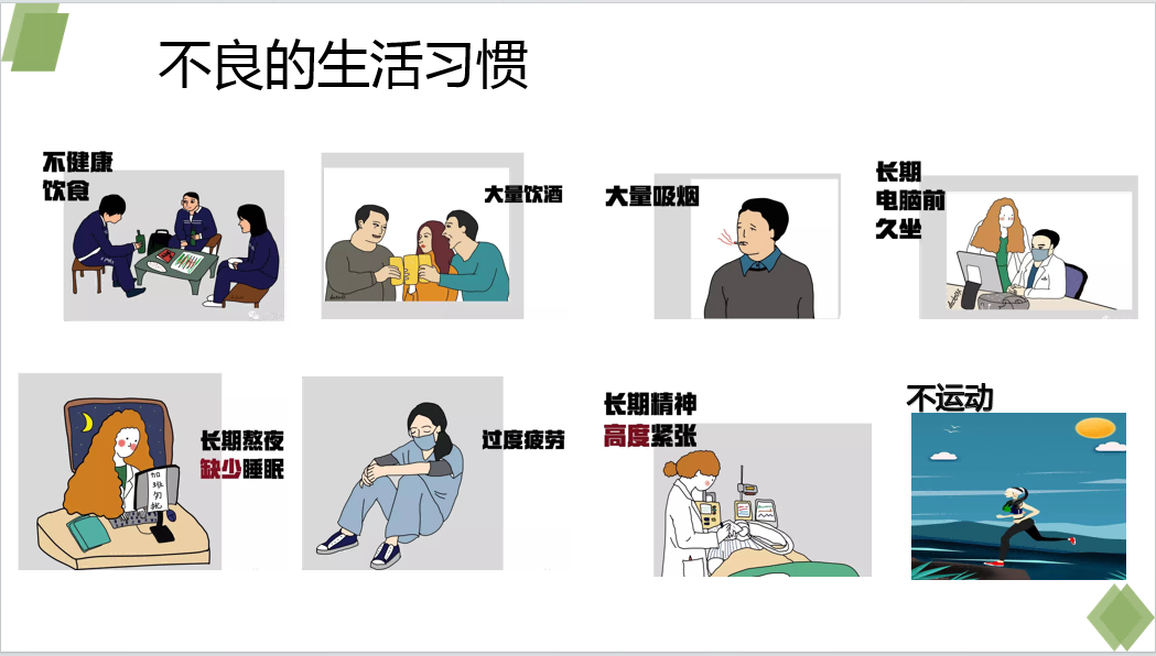 由于現(xiàn)今社會(huì)工作壓力大,生活節(jié)奏快等原因,人們?cè)谏钪写嬖谝韵虏涣忌盍?xí)慣:不健康飲食、大量飲酒、大量吸煙、長(zhǎng)期電腦前久坐、長(zhǎng)期熬夜缺少睡眠、過(guò)度疲勞、長(zhǎng)期精神高度緊張、缺乏運(yùn)動(dòng)等。這些不良生活習(xí)慣會(huì)導(dǎo)致人們的身體長(zhǎng)期處于“亞健康”狀態(tài),從而誘發(fā)一些慢性疾病?,F(xiàn)今“三高”等慢性疾病呈年輕化趨勢(shì),與這些不良生活習(xí)慣脫不了干系。
